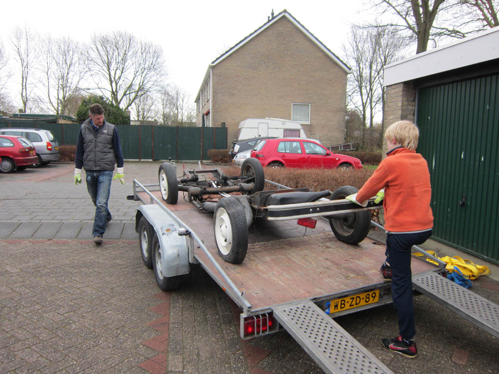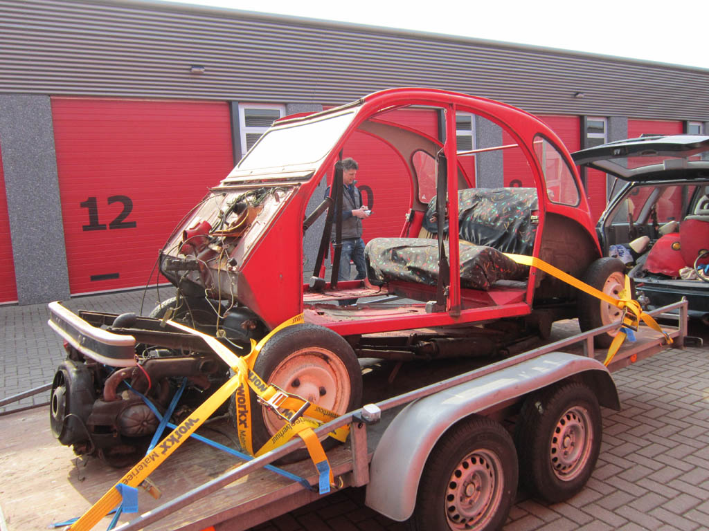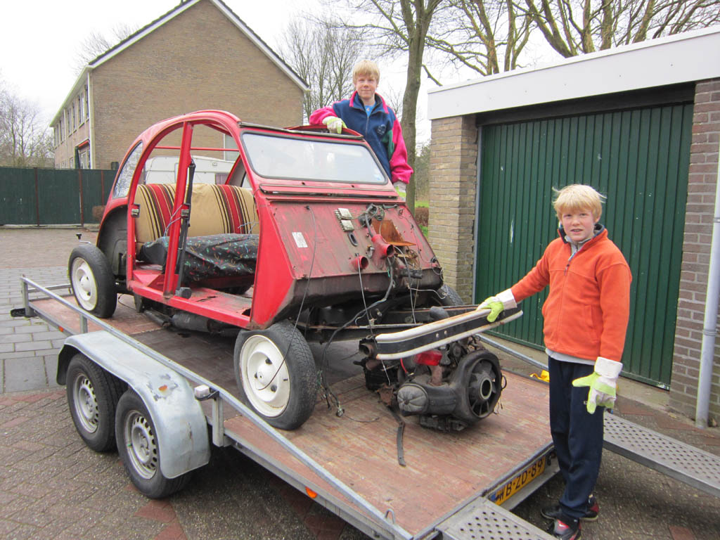 Zoals jullie op de fotoās kunnen zien hebben we de eend op 16 maart opgehaald. Het was een voorspoedige dag, Rienk-Bert en Jelle gingen samen naar Heerenveen met een gehuurde auto-ambulance, daar aangekomen hebben de vorige eigenaren en wij de eend op de auto-ambulance gekregen en verder de losse onderdelen in de auto gedaan, alles paste prima. Toen zijn we samen naar Joure gereden om de overdracht van de eend en de schorsing van de eend te regelen, ook dat ging vlot! En ten slotte helemaal happy met onze eend naar huis teruggereden en de eend met de auto-ambulance in de garage gestald.